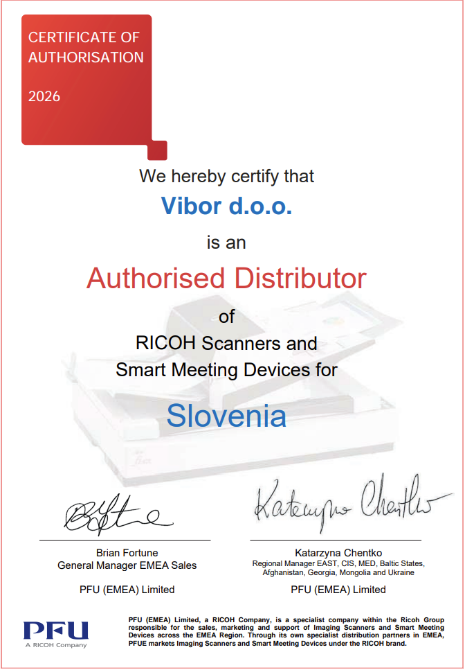 Ricoh skenerji in pametne naprave so zasnovani za učinkovito obdelavo dokumentov, optimizacijo delovnih procesov ter podporo digitalni preobrazbi organizacij. Z nadaljevanjem avtoriziranega statusa Vibor potrjuje svojo vlogo zanesljivega partnerja pri uvajanju sodobnih tehnologij in zagotavljanju dolgoročne podpore uporabnikom tudi v letu 2026.